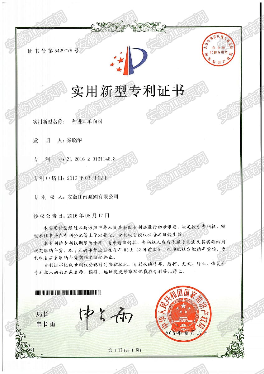 安徽江南泵閥有限公司榮獲進(jìn)口單向閥門(mén)專利證書(shū),主營(yíng):氟塑料泵,不銹鋼泵,耐腐蝕化工泵,品質(zhì)卓越,行業(yè)領(lǐng)跑企業(yè),科研生產(chǎn)型企業(yè)20年鑄就行業(yè)輝煌!...