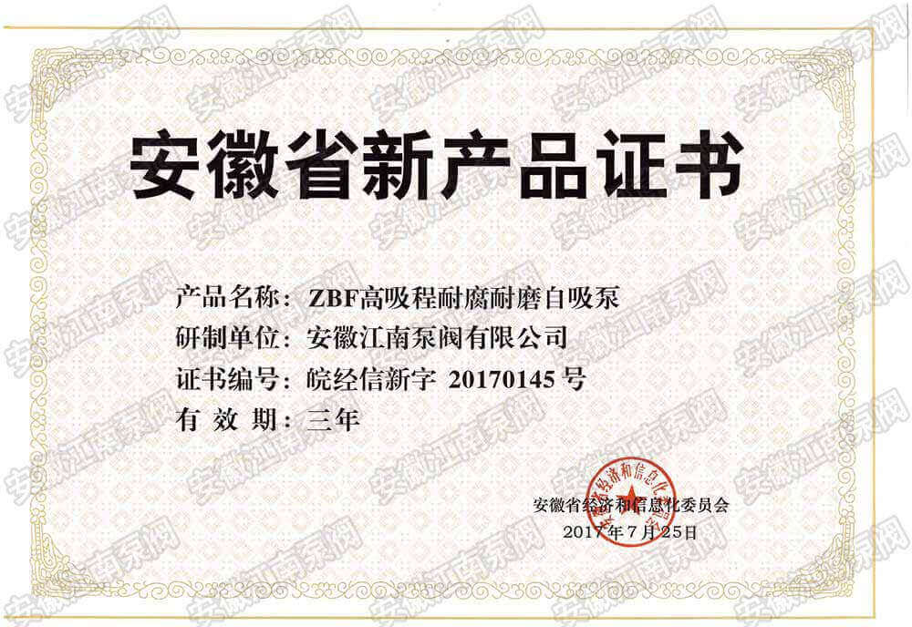 ZBF高吸程耐腐耐磨自吸泵產(chǎn)品證書  Hot!