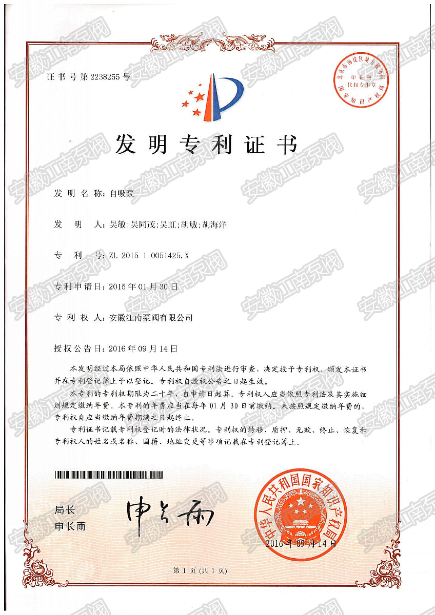 安徽江南泵閥有限公司榮獲耐腐蝕自吸泵發(fā)明專利證書,主營(yíng):氟塑料泵,不銹鋼泵,耐腐蝕化工泵,品質(zhì)卓越,行業(yè)領(lǐng)跑企業(yè),科研生產(chǎn)型企業(yè)20年鑄就行業(yè)輝煌!...